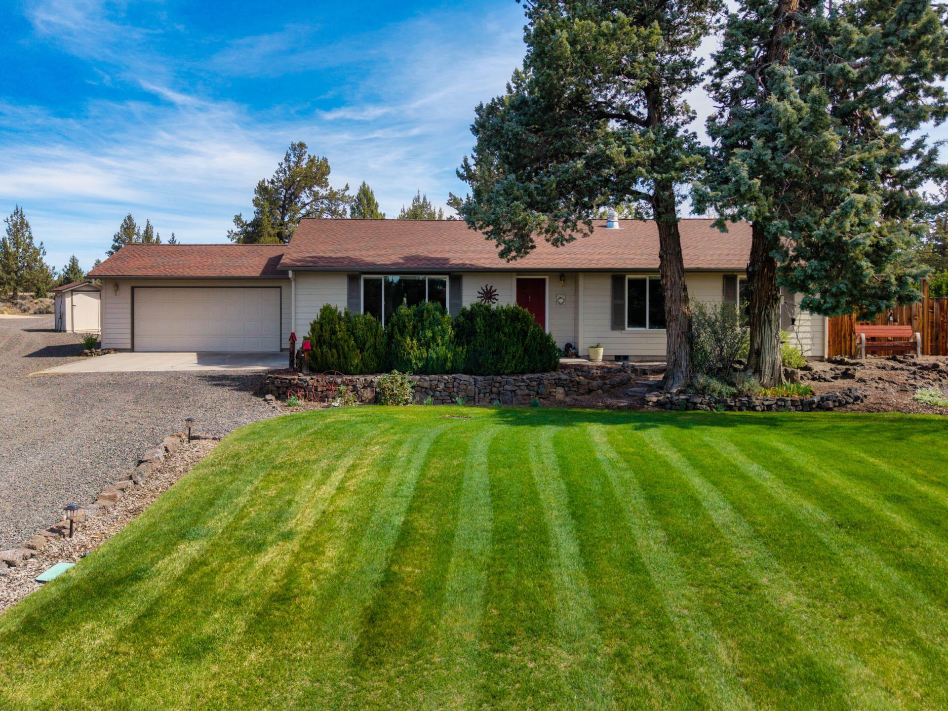 A rare small-acreage offering in coveted Tetherow Crossing with Cascade Mountain Views. Set on 4.5 peaceful acres just 7 miles from downtown Redmond, moments from the Deschutes River, and steps to miles of BLM land, this property invites a life of space and ease. The 1,716 sq ft home features an open, light-filled layout with 3 bedrooms and 2 baths, including a spacious primary suite with walk-in closet and beautifully updated bath. Outdoors, a fully fenced, park-like setting unfolds--mature landscaping, an established garden, redwood deck, and hot tub create a quiet retreat. The 24x30 insulated shop with 10 overhead door is heated, wired, and ready with 220V and 30-amp RV service. Thoughtful updates include a new roof (2025), deepened well (2023), and newer carpet (2021), plus underground sprinklers front and back.