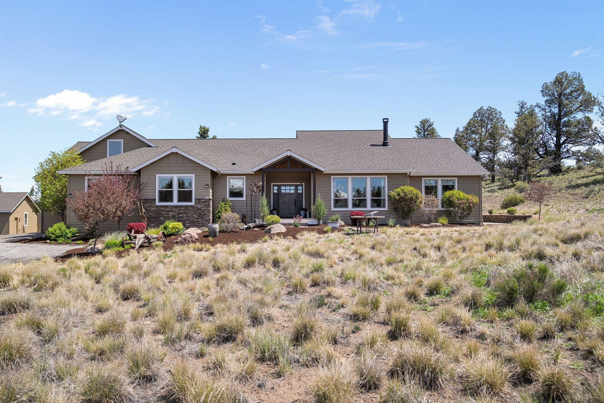A dream view property on 18.8 private acres with stunning views of the Three Sisters and Broken Top. Extremely private and bordered on three sides by 180,000 acres of public land. This custom-built home offers 3 bedrooms, 2.5 baths, plus a large bonus room for flexible use. The primary suite features a custom tile shower, clawfoot tub, dual closets, and private hot tub access. Professionally landscaped with low-maintenance sprinkler and drip systems, plus a custom waterfall feature. Enjoy covered, Trex decks. In addition to the oversized attached garage, there is a detached 2-car garage and a spacious 36x48 outbuilding ideal for a shop, horses, or kennel use. Centrally located between Sisters, Redmond & Bend.